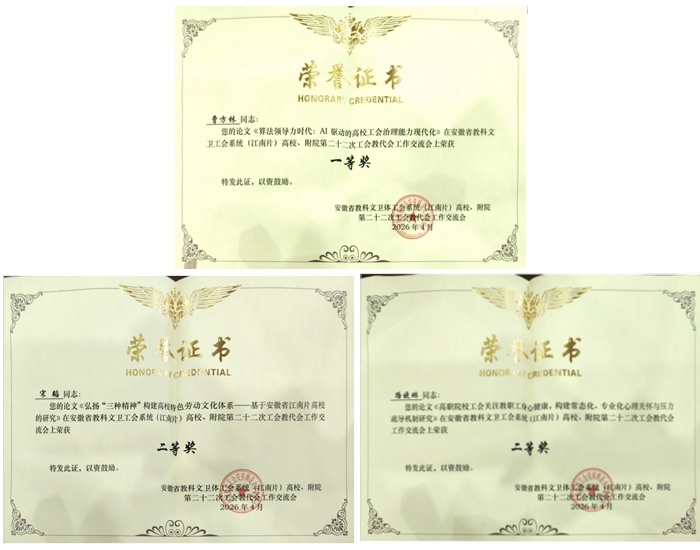 4月9日,安徽省教科文卫体工会(江南片)高校、附院第二十二次理论研讨会在安庆师范大学召开,我校工会副主席丁婷、会计学院分工会主席曹方林参加会议,丁婷在会上进行交流发言,分享了我校工会工作的实践经验与思考。会上公布了本次研讨会论文评选结果。曹方林老师撰写的《算法领导力时代:AI驱动的高校工会治理能力现代化》荣获一等奖;宋韬老师撰写的《弘扬“三种精神”构建高校特色劳动文化体系——基于安徽省江南片高校的研究》、路晓琳老师撰写的《高职院校工会关注教职工身心健康,构建常态化、专业化心理关怀与压力疏导机制研究》荣获二等奖,充分展现了我校工会理论研究和实践创新的扎实成果。