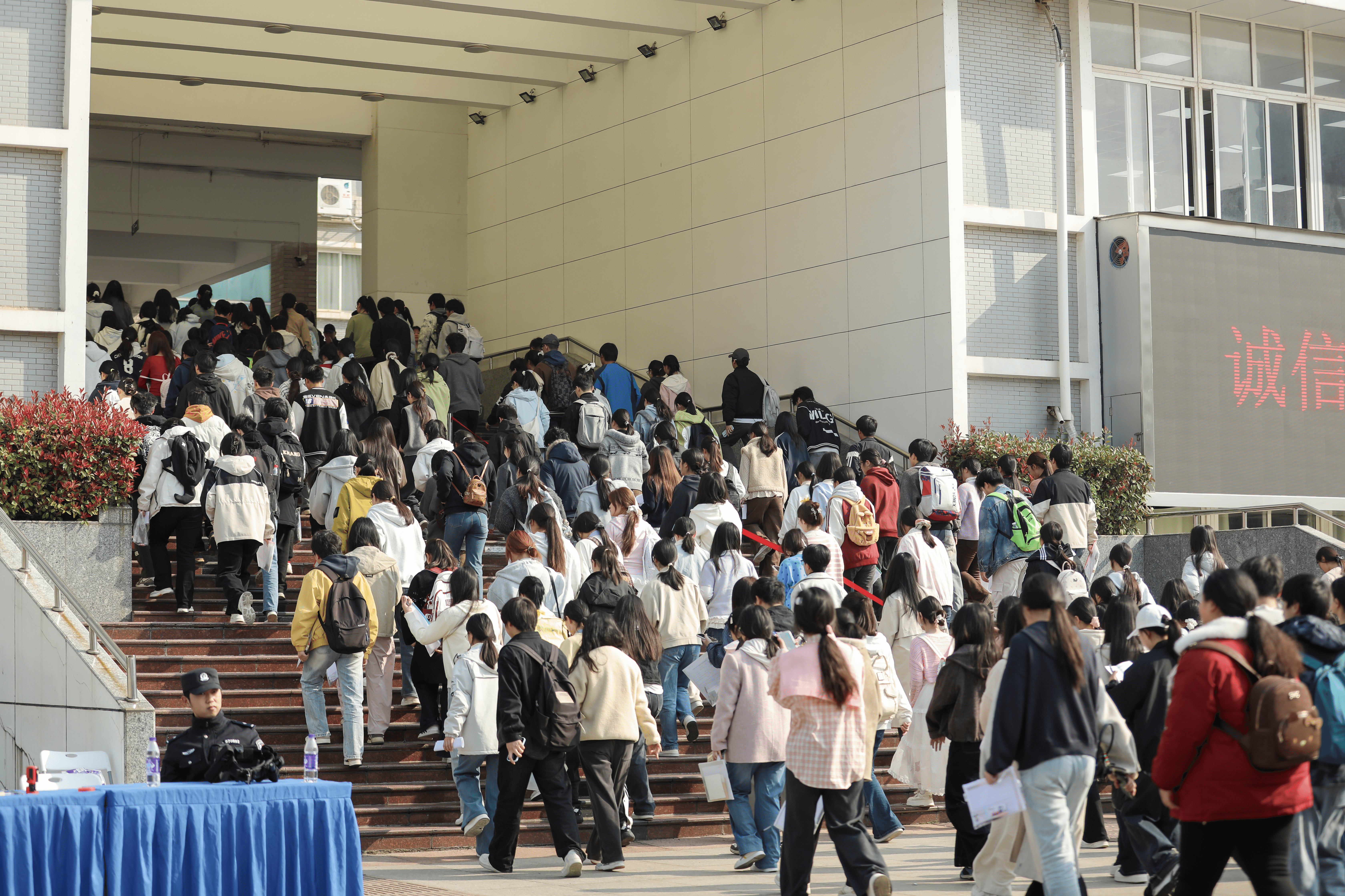 为全方位做好考生服务保障,学校将暖心服务贯穿考务工作全程:校园内提前布设清晰的引导指示牌、励志招生标语与考试须知;组建专业的师生志愿者服务队,在入校核验、考场引导、咨询答疑、后勤保障等岗位全程值守,耐心为考生及家长提供各类服务,用细致周到的举措缓解考生应考焦虑,营造出温馨和谐、规范有序的考试环境。