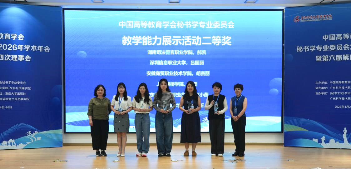 4月24日至26日,中国高等教育学会秘书学专业委员会2026年学术年会在广东省珠海市广东科学技术职业学院举行,本次年会以“数智时代秘书专业的转型与重构”为核心议题,同期举办了首届秘书学专业教师“教学能力展示”活动。